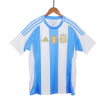 The Argentina Football Association (AFA) crest is proudly displayed on the chest, typically featuring the three stars above it, signifying their World Cup victories. The Adidas logo complements the design, positioned opposite the crest. The overall aesthetic is one of understated elegance, focusing on the core identity of La Albiceleste while celebrating their current era of dominance.
