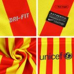 The 2013/14 Barcelona away kit broke away from traditional designs, opting for a truly unique and symbolic look. The design is a direct homage to the Senyera, the flag of Catalonia. The shirt features a striking vertical gradient transitioning from bright yellow at the top to a deep red at the bottom. This wasn’t just a stylistic choice; it was a powerful visual representation of the club’s deep roots and identity within Catalonia. The four red stripes of the Senyera are subtly integrated into the design through this gradient effect, making the shirt a proud statement of Catalan pride worn on pitches across Spain and Europe.