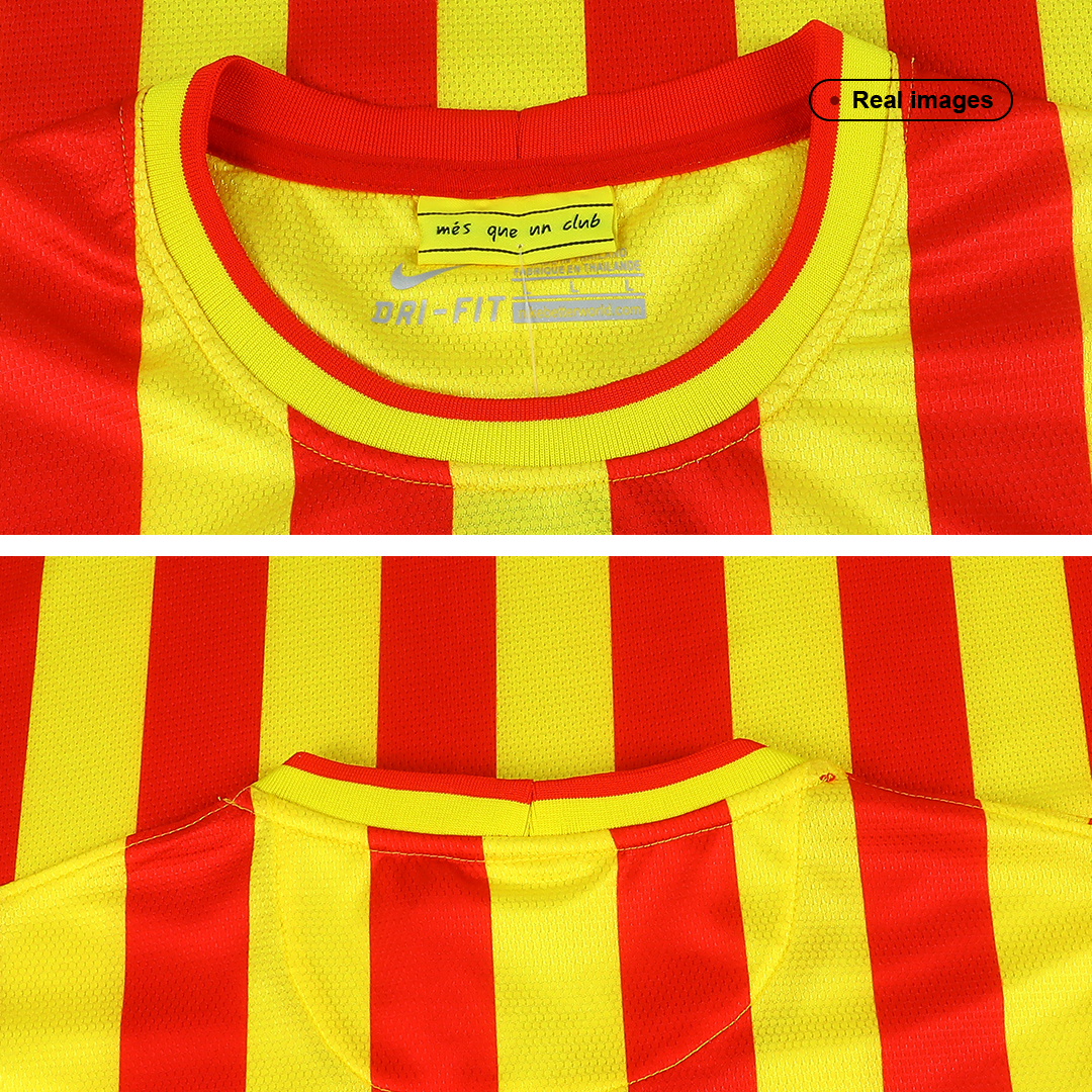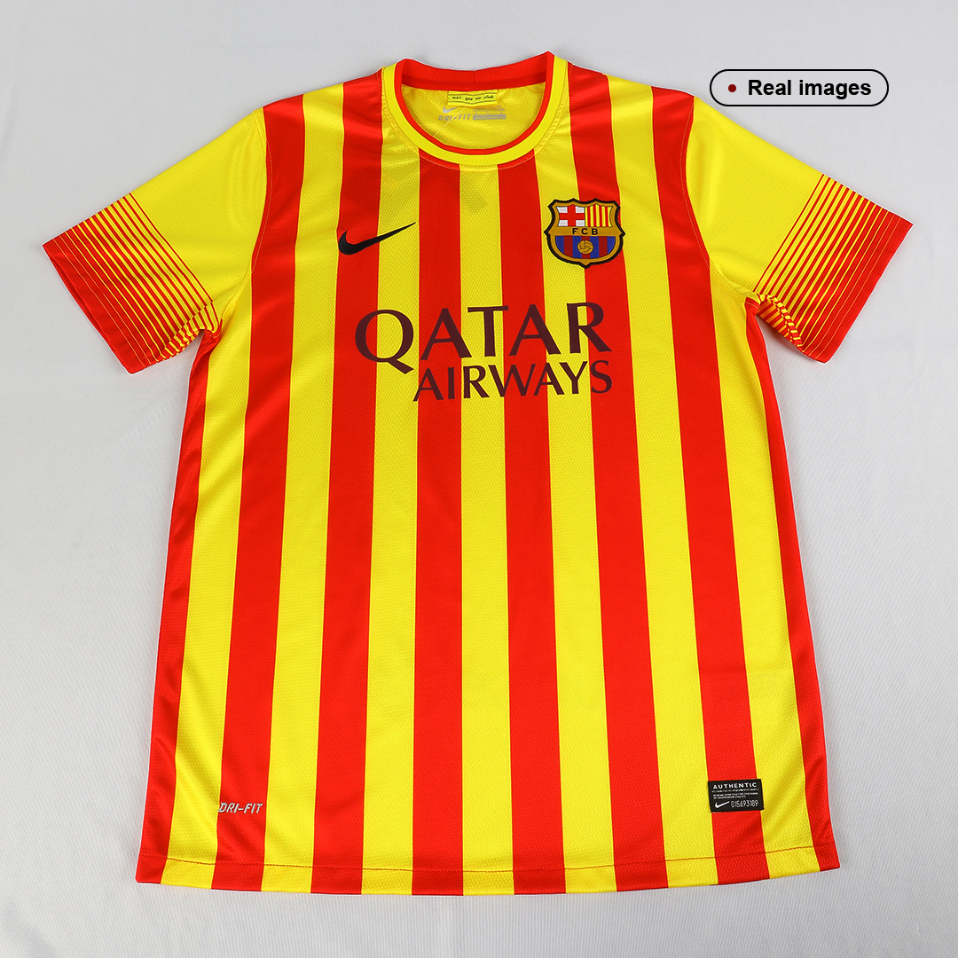 Relive the vibrant 2013/14 season with this iconic FC Barcelona away jersey, featuring the striking yellow and red gradient inspired by the Catalan flag. A must-have for any true Culer. Own a piece of history!
