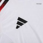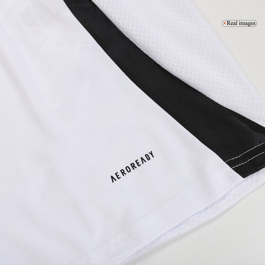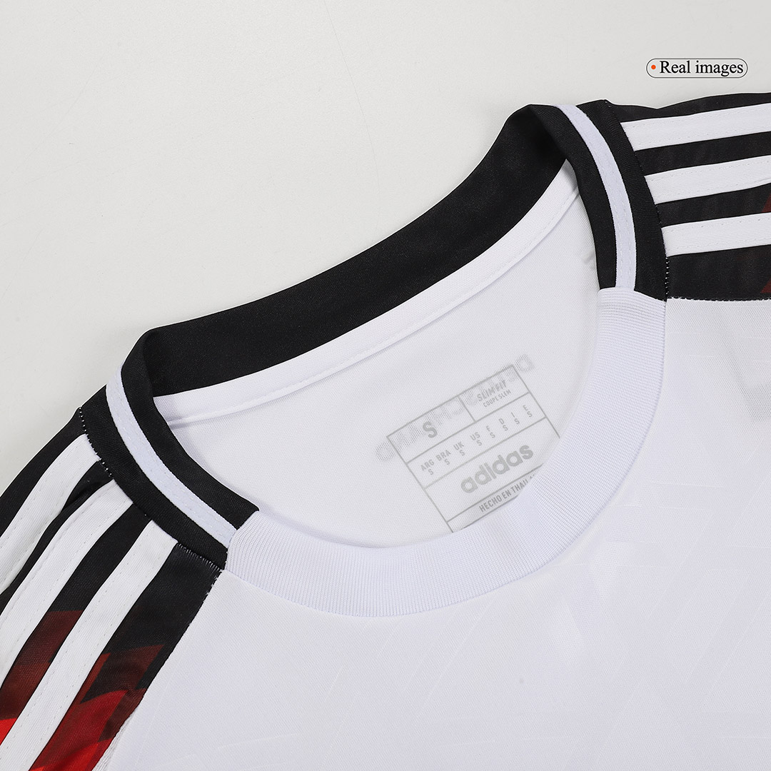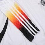 The Germany Euro 2024 Home Jersey is a striking blend of tradition and contemporary design, crafted by Adidas. This kit pays homage to the rich history of German football while embracing a fresh, dynamic aesthetic for the modern era. The core white base is instantly recognizable, symbolizing purity and the nation’s classic football identity. What sets this design apart is the gradient pattern flowing across the shoulders and sleeves. Inspired by the wings of the German eagle, this unique graphic transitions from black through red to gold – the iconic colors of the German flag. This visual element adds a sense of movement and power, reflecting the team’s energy on the pitch.