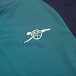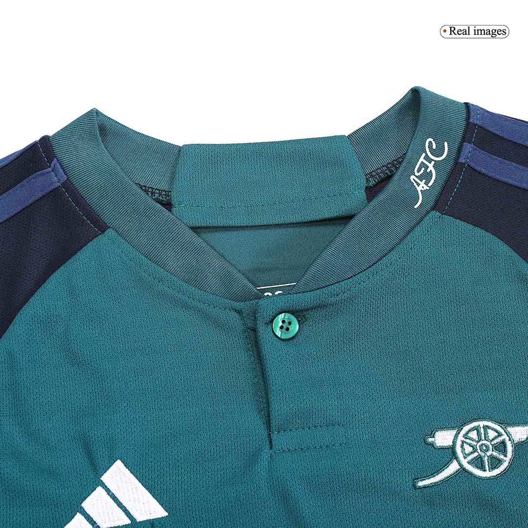 The dominant colours of the kit are a vibrant green and a deep navy blue. This unconventional combination for Arsenal creates a fresh and modern look. The green serves as the base colour for the jersey, while navy is used for accents, including the sleeves, collar trim, and the iconic adidas three stripes. This palette ensures the kit is highly visible and instantly recognizable, whether on the pitch or in a crowd.