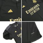 The Real Madrid 2023/24 Third Away Kit draws inspiration from the vibrant energy and modern architecture of Madrid, while staying true to the club’s rich heritage. Breaking from traditional away colors, this season’s third kit features a sophisticated dark grey/black base, accented with subtle yet striking details. The design incorporates a unique, abstract graphic pattern subtly woven into the fabric, representing the dynamic pulse of the city and the club’s forward-thinking vision. This isn’t just a jersey; it’s a wearable piece of art that connects the wearer to the heart of Madrid and the global phenomenon that is Real Madrid.