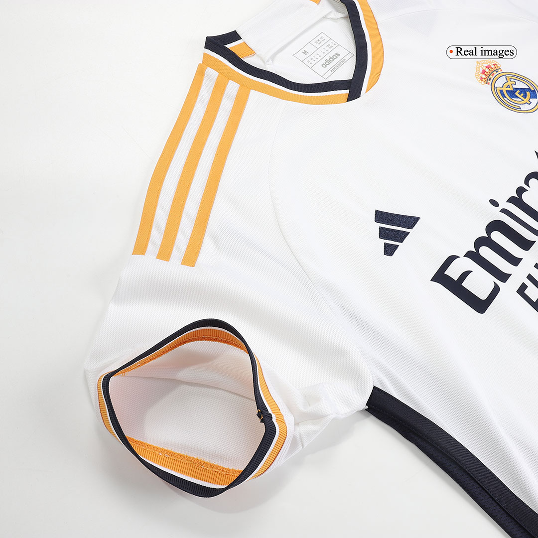 The 2023/24 Real Madrid home jersey is a modern classic, blending timeless elegance with subtle, impactful details. The pristine white base, synonymous with the club’s identity, is complemented by striking gold accents on the Adidas stripes, logos, and collar trim. This gold detailing evokes the club’s royal status and glittering history.