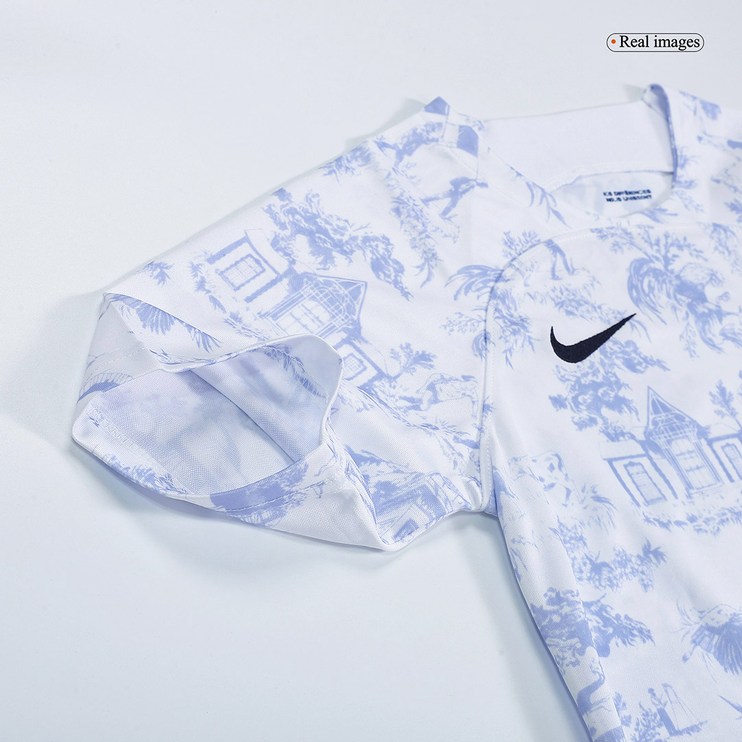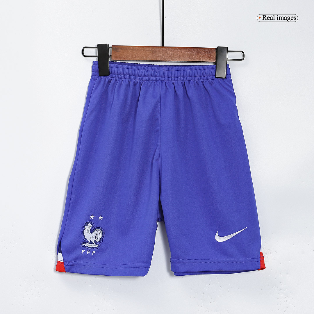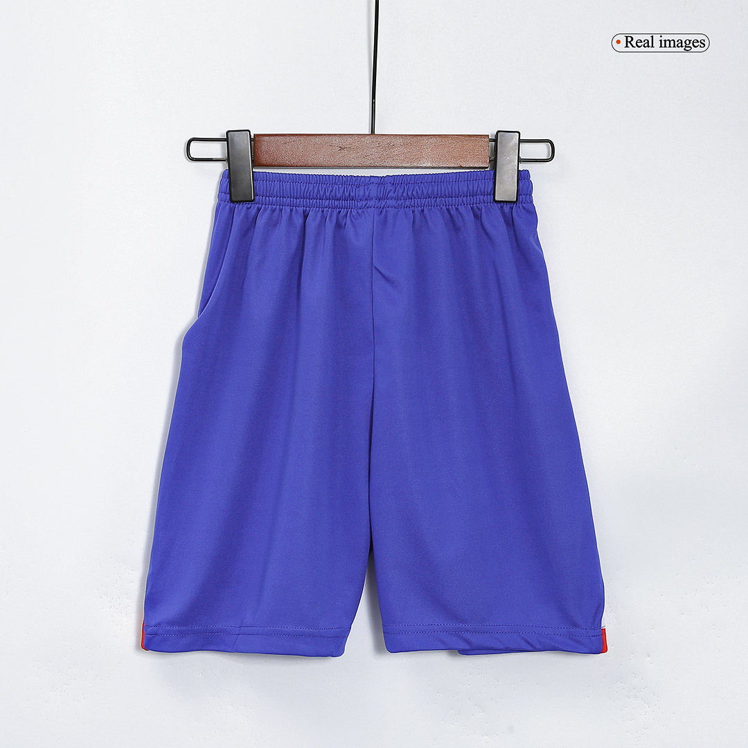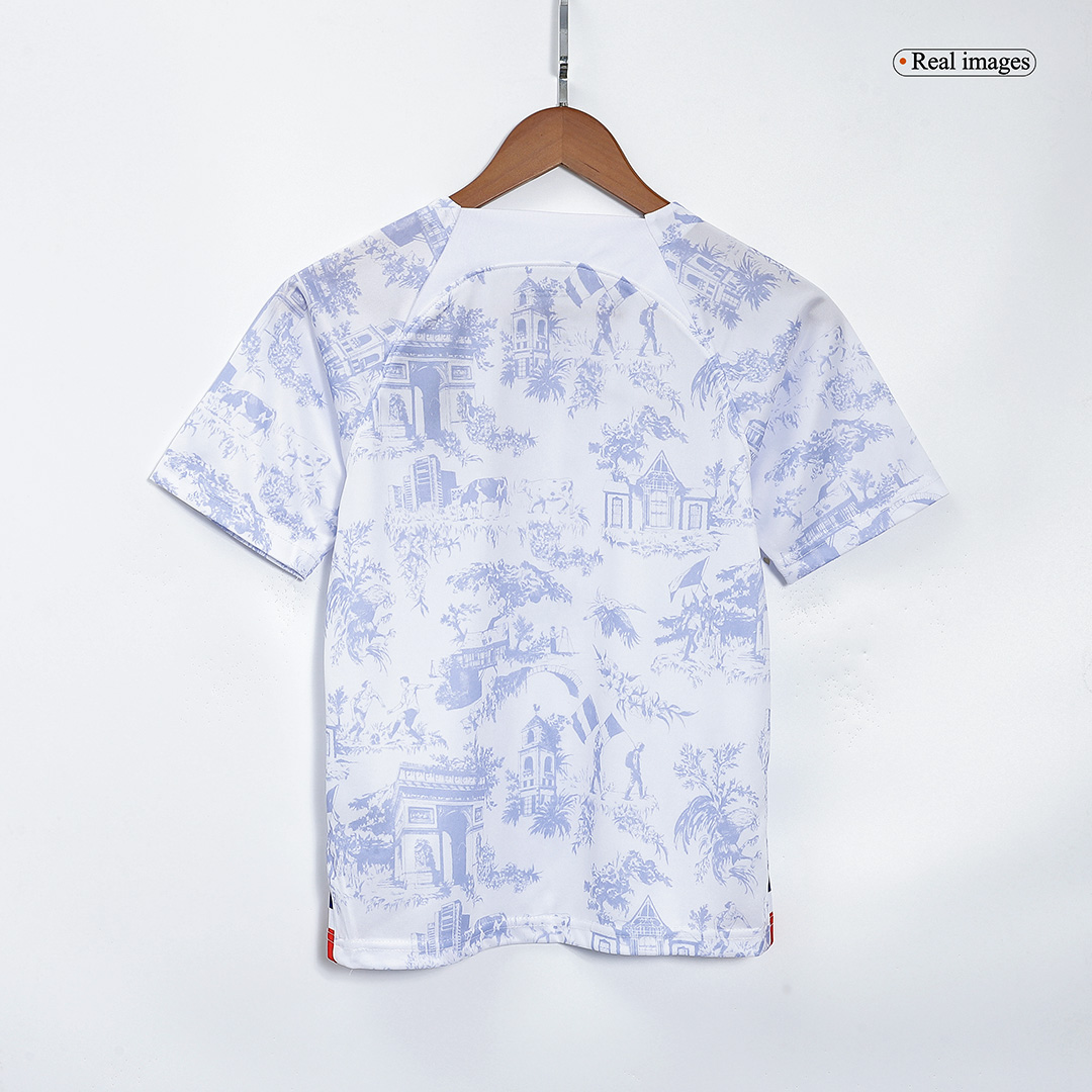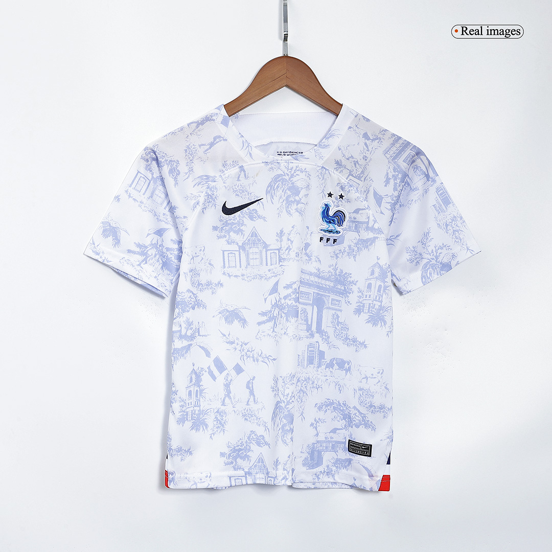 Ignite their passion for Les Bleus! Get the official Kids France 2022 World Cup Away Soccer Jersey and Shorts Kit. Perfect for young fans to wear their pride and cheer on their heroes. Shop the authentic fan look now!