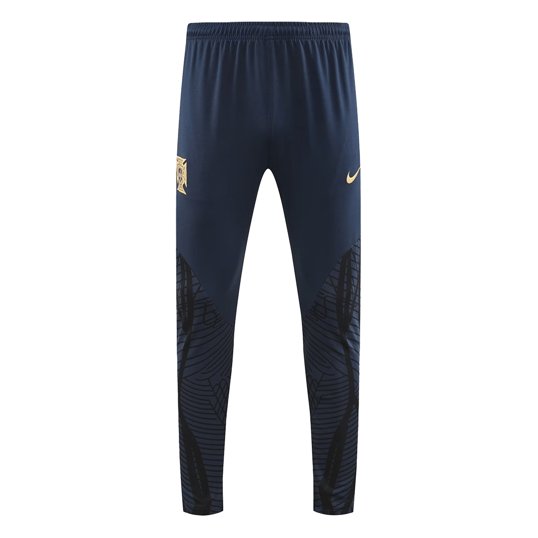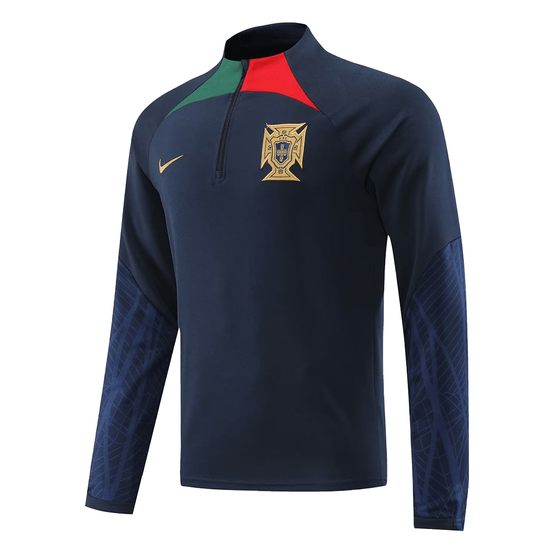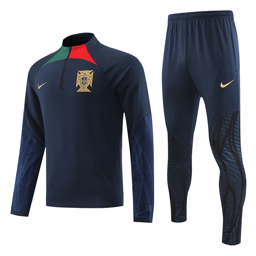 The 2022 Portugal training collection featured a sleek, modern aesthetic, primarily in a sophisticated Dark Obsidian (dark blue/black) with striking Rio Teal (greenish-blue) accents and subtle gold detailing. This tracksuit kit captures that look perfectly. The design is clean, professional, and instantly recognizable as part of the 2022 World Cup collection. The focus here is on providing fans with an authentic visual connection to the team’s training gear while prioritizing everyday comfort and durability.