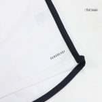 • Gold and Navy Accents: The classic white base is elegantly complemented by navy and gold detailing. These colours appear on the collar, cuffs, and the iconic Adidas three stripes running down the shoulders. The gold adds a touch of regality, reflecting Real Madrid’s status as football royalty, while the navy provides a sharp contrast.