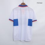 The jersey features a classic fold-over collar, often in white or trimmed with red, adding a touch of retro elegance that is highly sought after by collectors and fans alike. This collar style evokes a sense of nostalgia for an era when football kits had a distinct, less streamlined look compared to today’s designs.
